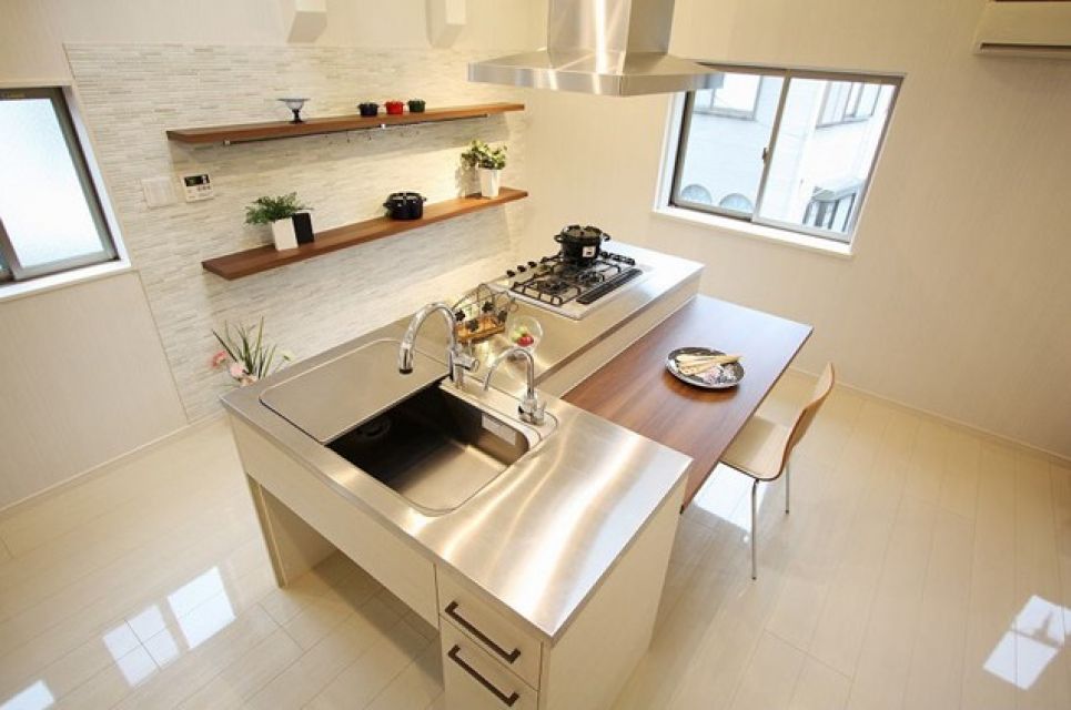 キッチンの天板はステンレスを採用し高級感のある仕上がりに。キッチン横にはオーダー製作したテーブルを据え付け、一体的に使うことが出来ます。