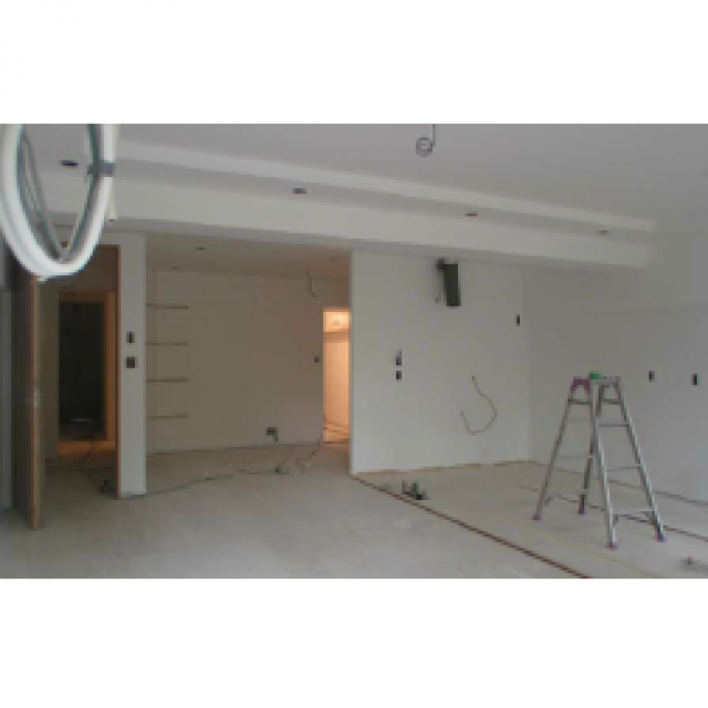 リビングは、本格的なホームシアターが出来上がりました。スピーカーとスクリーンは天井に埋込み、ブルーのクロスの上部からスクリーンが下りてくる仕組みです。