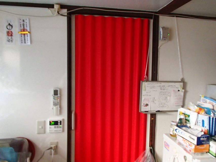 【内装リフォーム】 アコーディオンカーテンを取り付けました。お客様のご希望により、鮮やかな赤い色へ。お部屋が、一気に明るく、おしゃれになりました!