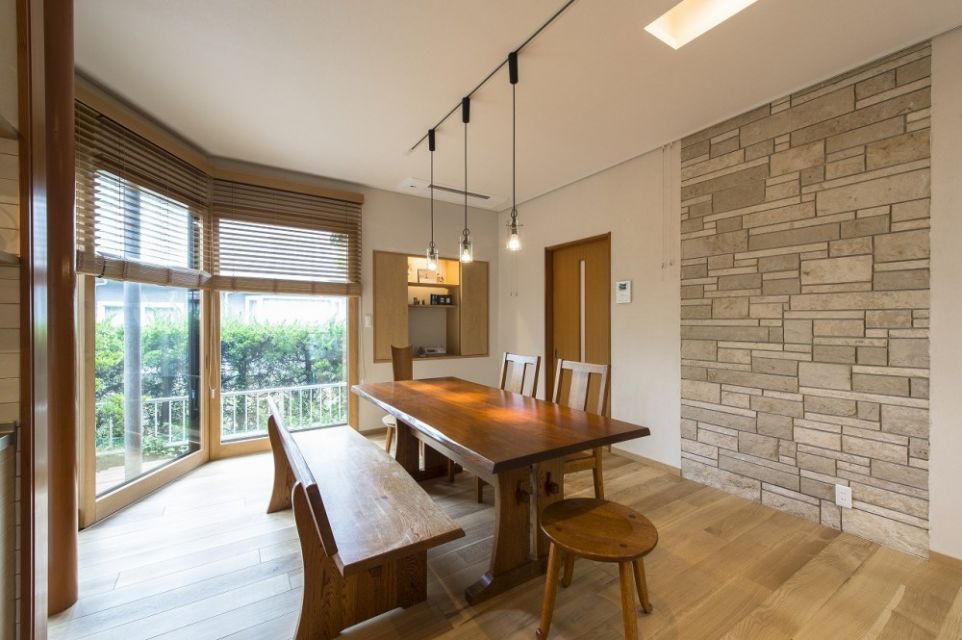 趣きのある自然石をリビングとダイニングに貼って重厚感を出しています。