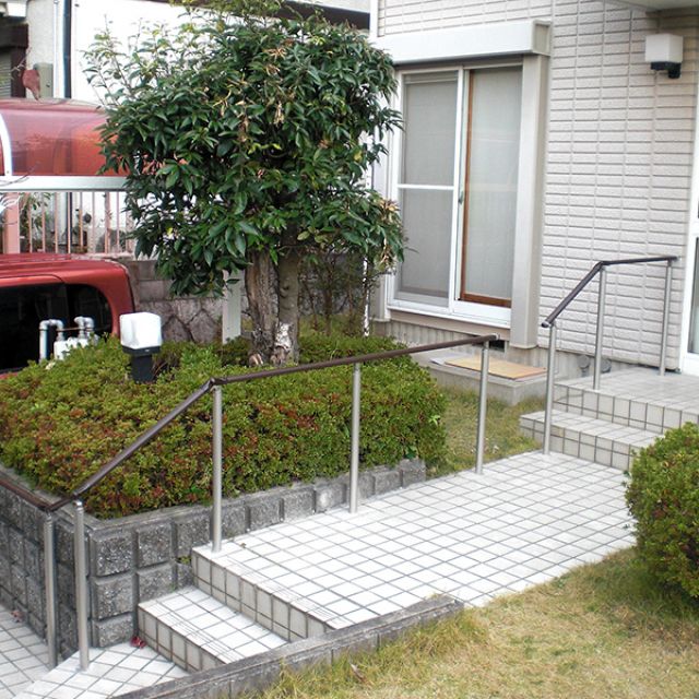 (介護リフォーム事例)屋内はもちろん、屋外にも手すりを設置して、安心して外出できるようになりました。
