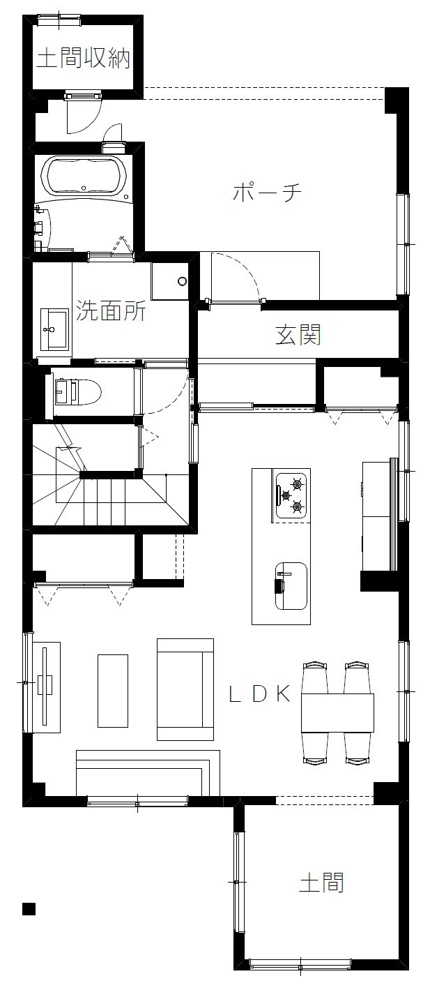 2階のお風呂・洗面脱衣・玄関を1階に持っていく事で空いた空間を有効利用し、