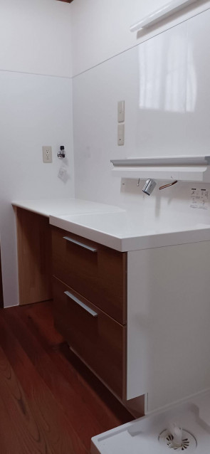 洗面台にあわせて作っていただいたカウンターも、クロスとあっていて明るく広々とした出来上がりになりました。 |