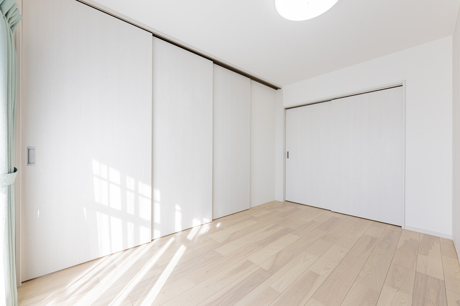 収納扉は壁と同じ白に。たまにリビングの一部にもなる洋室は、収納を設けても圧迫感がなく広がりのある空間です。