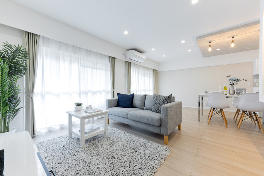 リビングは広くして、造作下がり天井によるカーテンボックスを新設。壁との一体感で空間を引き締め、すっきりとした印象になりました。