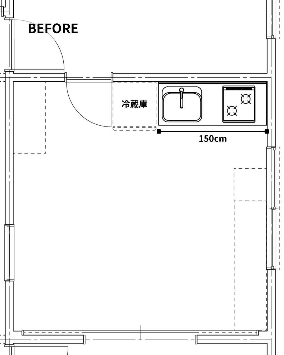 改修前はキッチンの間口が150㎝しかなく、