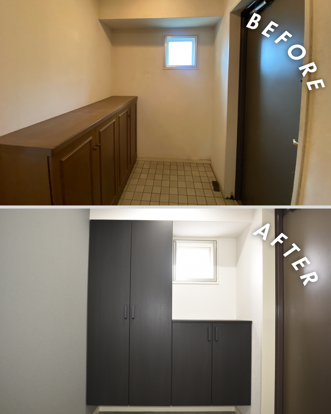 クロスの色や、収納に変化をつけるだけでもまるで違うお部屋に変身しますね。 家全体と統一感のとれた素敵なお仕上がりとなりました。