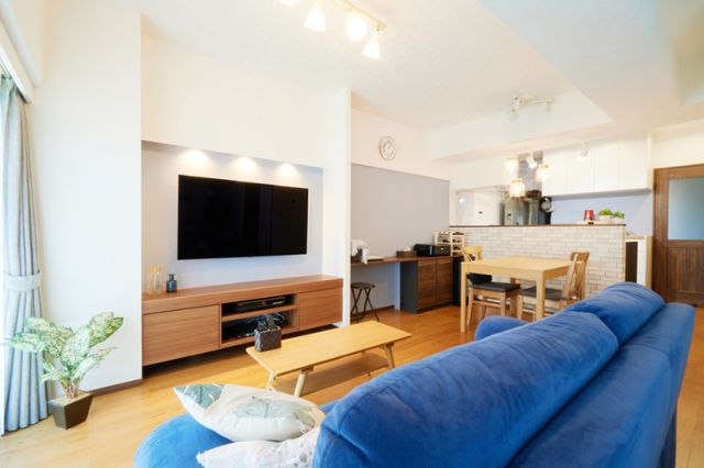TVまわりが印象的なLDK空間に。青いアクセントカラーの壁紙は以前から使用している青いソファに合わせてお客様ご自身でセレクトされたもの。