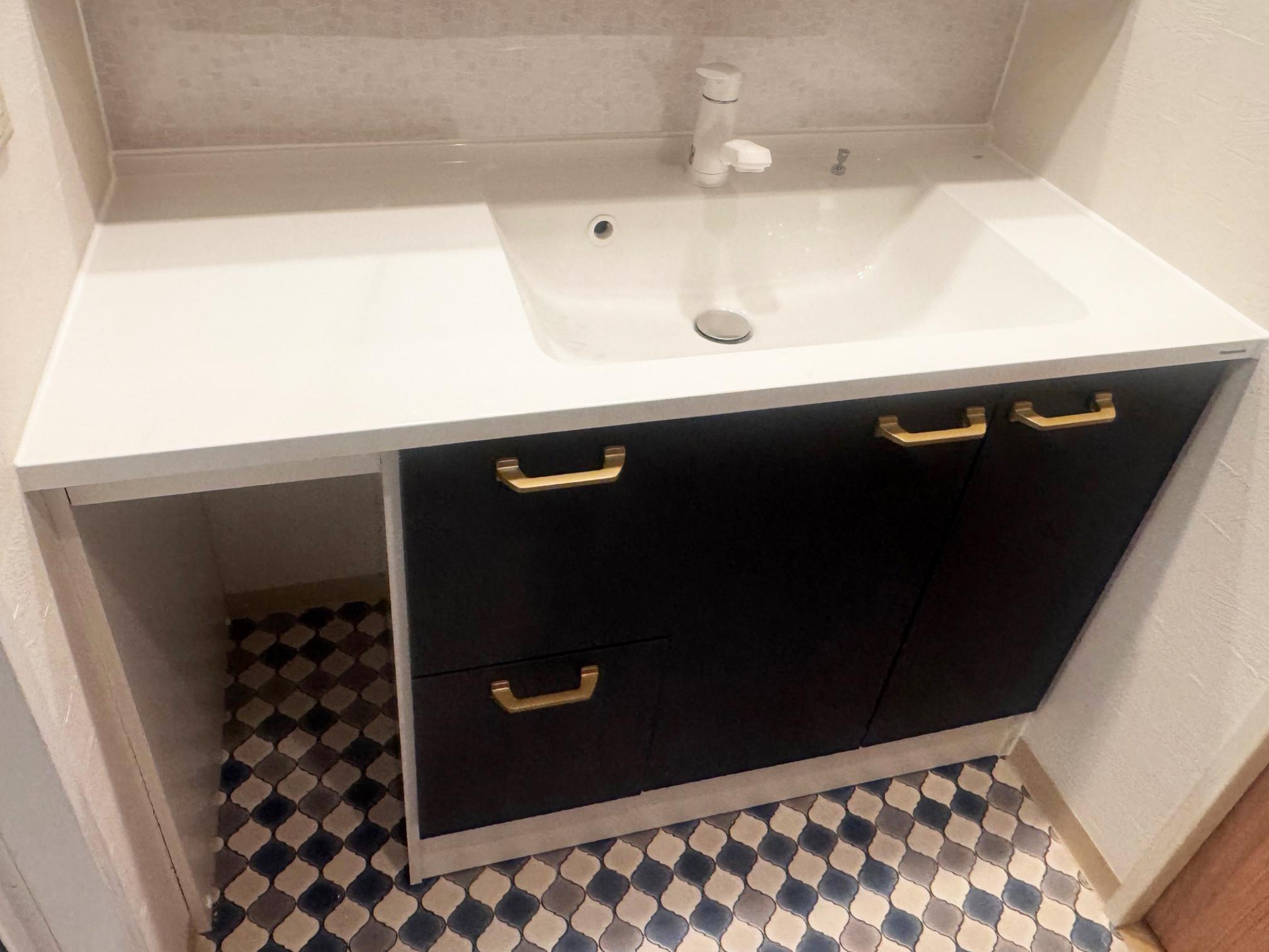 設備が古くなり、浴室と洗面室のリフォームをご検討中で、できるだけ早くリフォーム工事をしたいことと、洗面化粧台は、PanasonicのCラインの引出しタイプか開き扉で、扉カラーはネイビーオーク柄をご希望でした。現地調査に行かせて頂き、急ぎ見積りを作成してご提案後、ご検討頂きご契約となりました。お客様のご希望期日に間に合うように施工させて頂けて良かったです。洗面所のクッションフロアのモロッコタイル柄は、モロッコ発祥のタイルで、幾何学模様が特徴的なモザイクタイル柄で、モダンでお洒落な洗面室に仕上がりました!