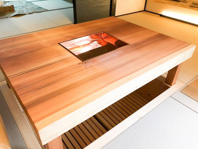 また、ダイニングテーブルやカウンターに用いる桧、杉、タモ、楠、シイ、シデなどの一枚板も展示しています。