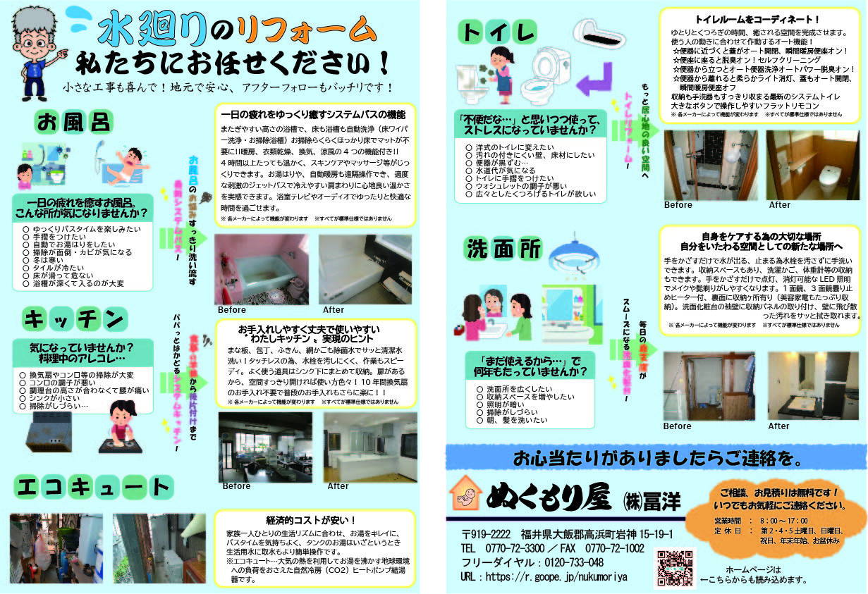 冨洋は水まわりが得意なリフォーム店です。すべて自分たちの手で。地域密着、スピード対応いたします。