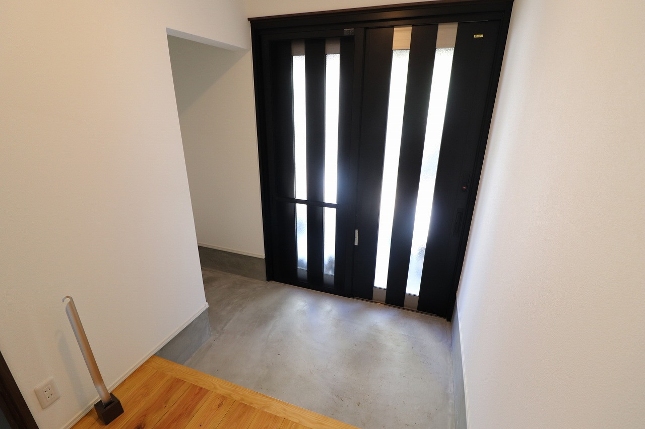 【玄関】 玄関は雨で濡れると滑りやすいタイル床からモルタル床に。以前あった押入れも解体し広い空間にしました。