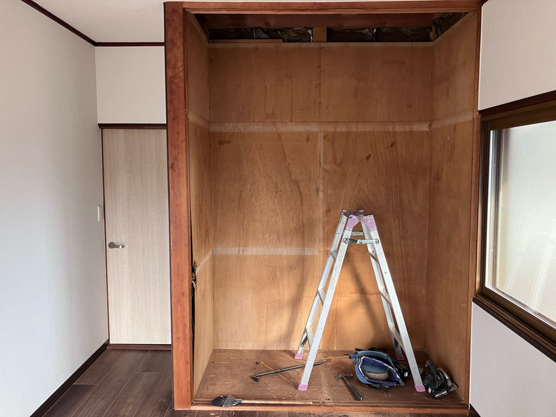 (施工中…) 引き戸や間仕切りをすべて取り払いました。収納の内壁がベニヤ板になっていますが、耐久性を高めるための工事が必要です。