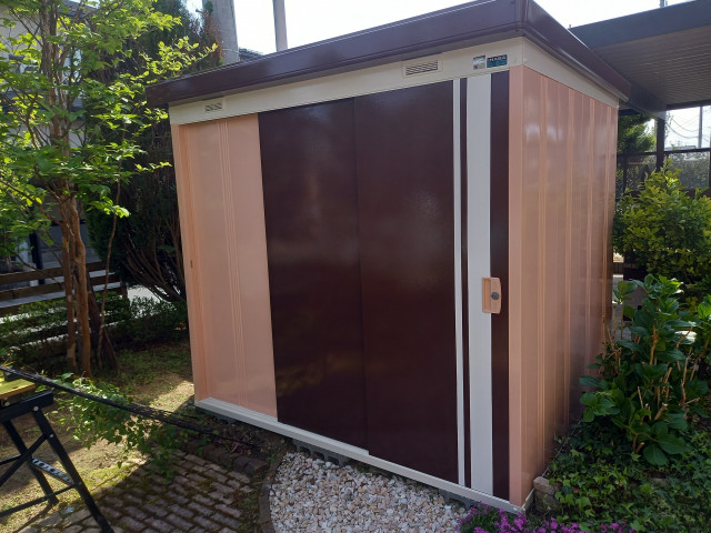 8年前に全面塗り替えさせて頂き、今回は屋根の谷部分に雪止め金具の追加と、軒先にスノーネットの取り付け、そして、庭先の物置を奥様プロデュースにて塗り替えました。住まいの色にコーディネートした拘りの配色です。