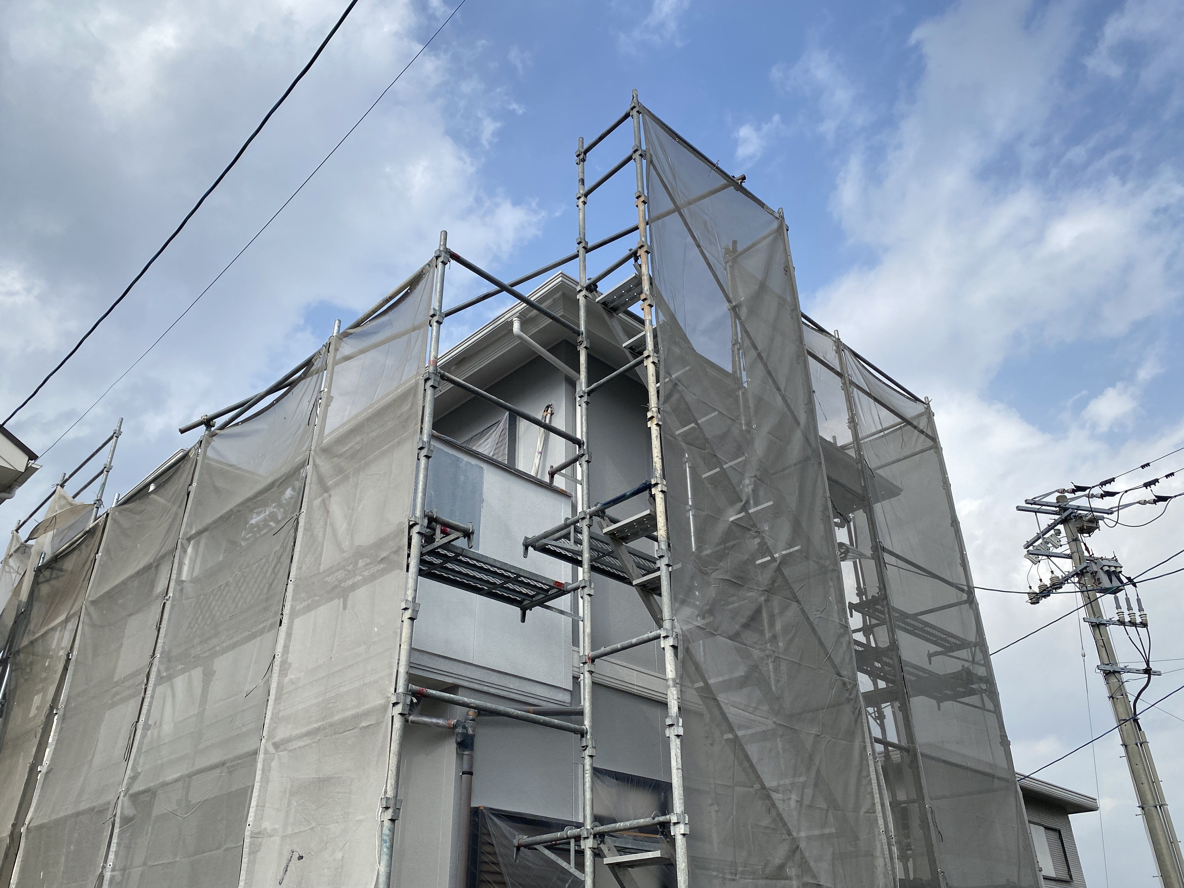 木工事を進めつつ、外回りは足場を組み外壁塗装工事が行われています。