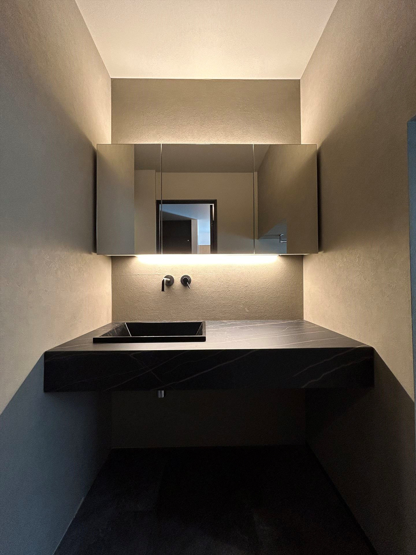 洗面台は造作にし、ミラーに間接照明を取り入れ、ホテルのような印象になりました。