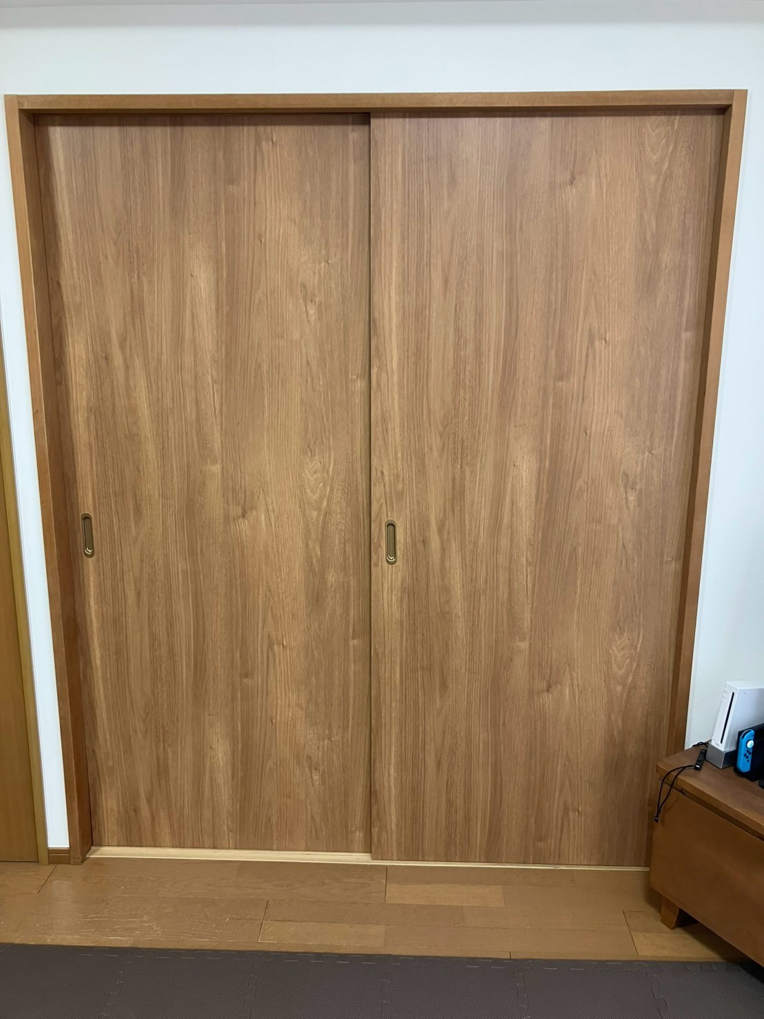 周りの建具と違いが出ないように似たような木目化粧シートを探しました。